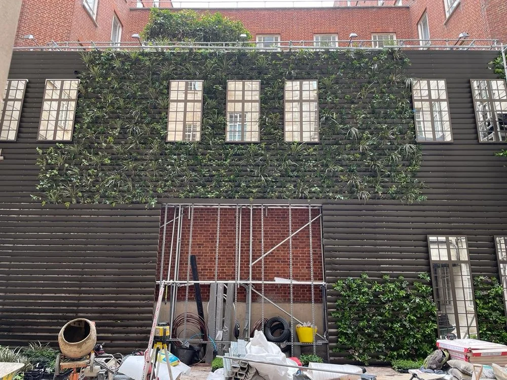 In 2021, Life on Walls collaborated with Bowles & Wyer to deliver a large freestanding living façade for the Marriott Grosvenor Square in London. The project aimed to soften the visual impact of a dominant brick boundary wall and create a calmer, greener atmosphere within the courtyard space.